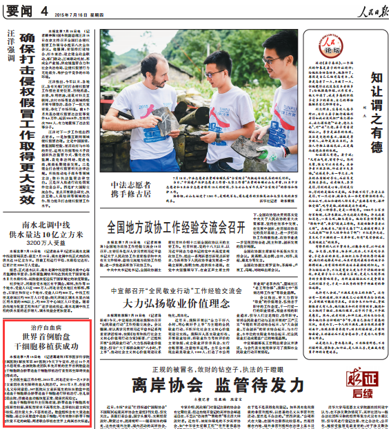 主治医生扈江伟介绍,2013年,河北迁安市一名9岁农村女童因患再生障碍贫血入院治疗。2014年3月,在征得患儿父母同意后,307医院从女童新诞生的妹妹胎盘中提取造血干细胞联合脐带造血干细胞进行移植治疗,患儿康复后出院,目前造血功能恢复正常,健康状况稳定。